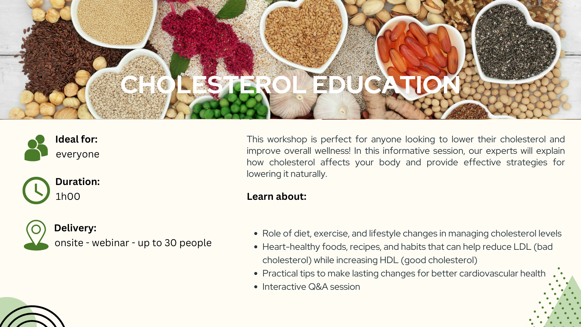 A Cholesterol Education Workshop provides valuable insights into managing cholesterol levels and understanding its impact on heart health. Participants will learn practical tips for making heart-healthy lifestyle choices, reducing risk factors, and promoting long-term well-being.