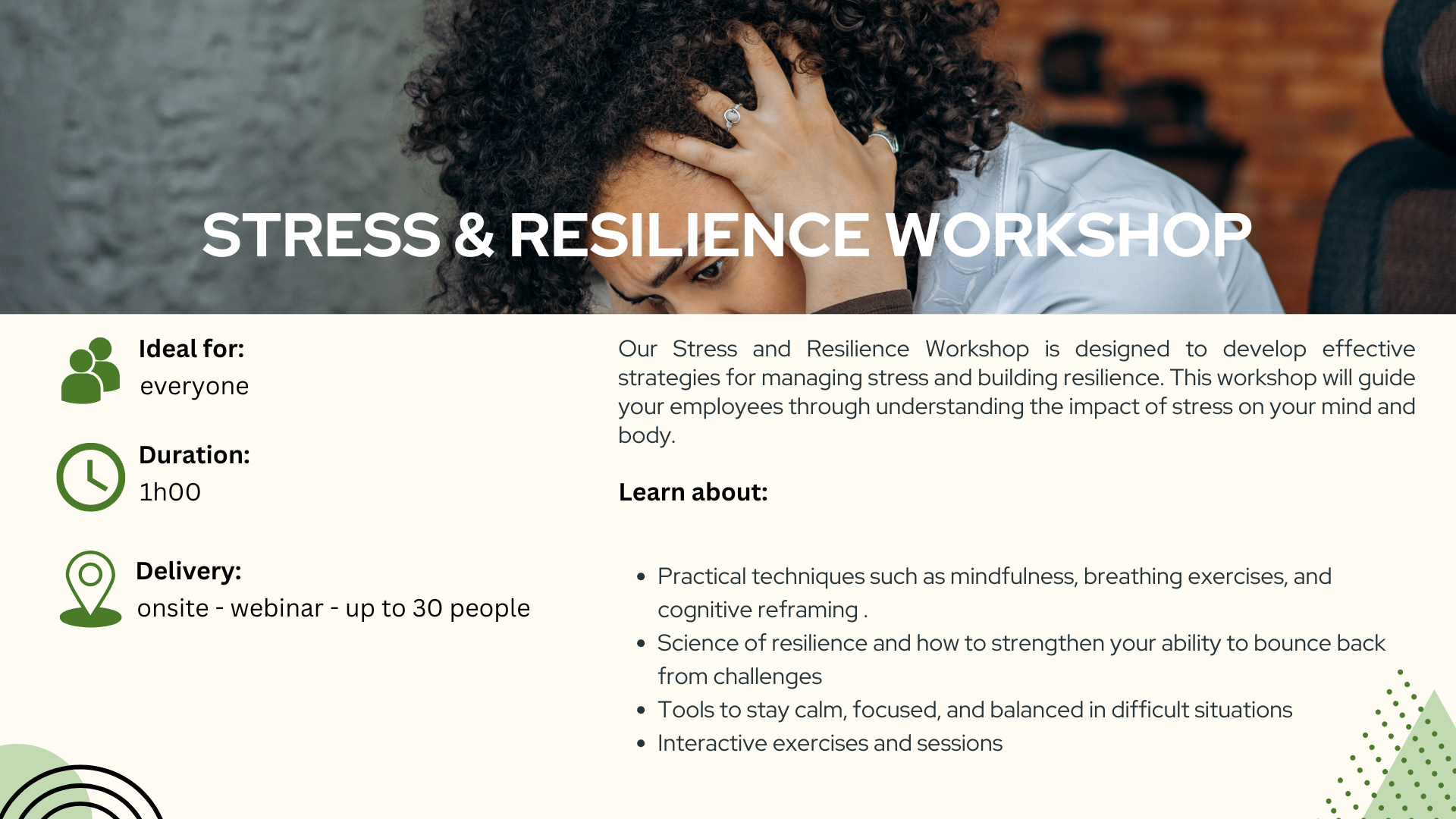 A Stress and Resilience Workshop equips participants with essential tools to manage stress and build emotional resilience. By learning effective coping strategies, individuals can enhance their mental well-being, improve focus, and thrive in challenging situations.